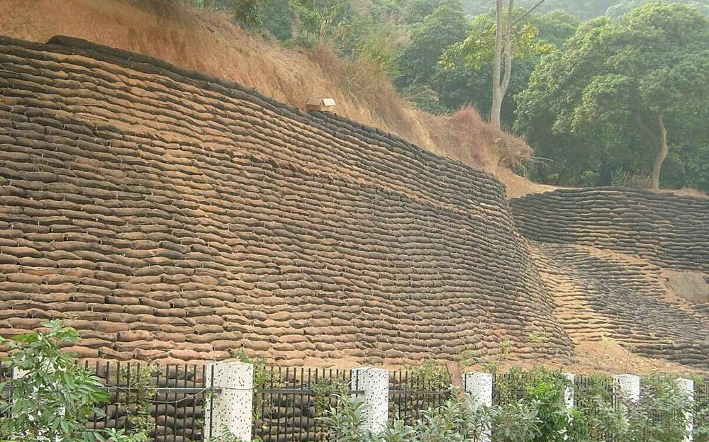 ①生態袋裝土時,考慮到后期坡體的綠化,選擇適合植物生長的土壤,并加入保水劑、肥料、中砂等摻合料。保證每袋裝土不宜超量(50kg/袋),每袋裝土均勻。避免袋體產生較大變形及夯實時產生漲破。