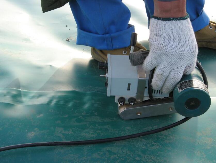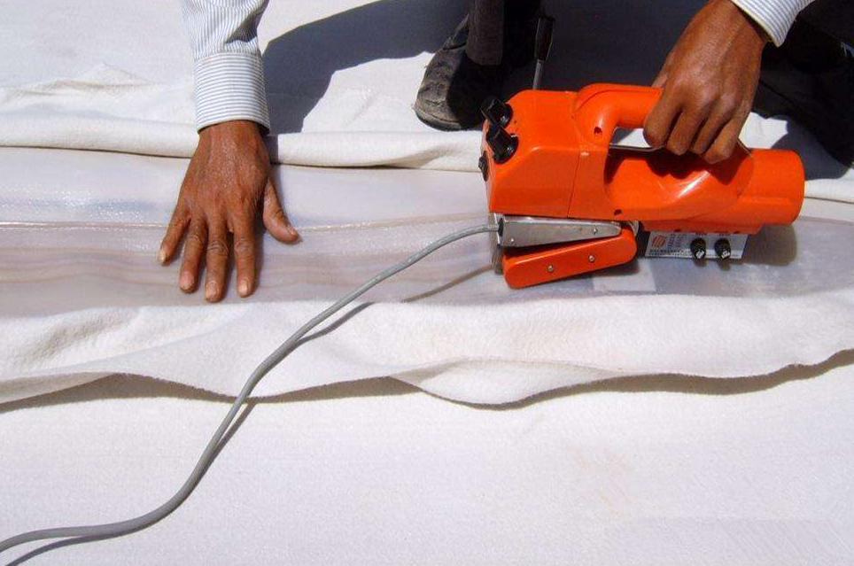 土工膜的試驗(yàn)性焊接要求,焊接工作開展之前必須進(jìn)行試焊,試焊應(yīng)在裁剪的土工膜樣品上進(jìn)行,樣品長度不小于1米,寬不小于0.2 米,每天早、中開工分別要做一次試焊。試樣用拉力機(jī),進(jìn)行現(xiàn)場剝離及剪切試驗(yàn),焊縫不被撕拉破壞,母材被撕裂開為合格,確保焊接機(jī)性能,焊接方法,焊接溫度等外界條件無誤后,征得監(jiān)理工程師或業(yè)主代表同意后,用已調(diào)節(jié)好工作狀態(tài)的熱楔焊機(jī)逐幅進(jìn)行正式焊接。