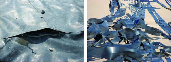 土工膜在運(yùn)輸、安裝和運(yùn)行過程中會(huì)產(chǎn)生破損,破損的土工膜造成防滲系統(tǒng)失效,產(chǎn)生環(huán)境污染事件。采用回料生產(chǎn)的土工膜質(zhì)量差,被大量應(yīng)用于垃圾填埋場(chǎng),對(duì)填埋場(chǎng)的安全運(yùn)行帶來巨大隱患。