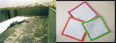 該材料安裝于地下防水(防滲)工程中,具有長效、自行封閉、施工簡便、環(huán)保、性價比高的特點(diǎn)。膨潤土粒子吸水膨脹在添加劑作用下,形成均勻的膠體系統(tǒng),其滲透系數(shù)為10-9cm/s,并充滿整個空間,在人為外力限制作用下,使防水毯的膨脹從無序到有序,持續(xù)的吸水膨脹結(jié)果,使防水毯自身達(dá)到密實(shí),從而具有防水作用。一些膨潤土顆粒在一定的大壓力作用下可直接進(jìn)入周圍土體的細(xì)小裂隙及混凝土結(jié)構(gòu)的細(xì)下裂隙中遇水膨脹,進(jìn)一步保證了地下工程防水抗?jié)B性能。